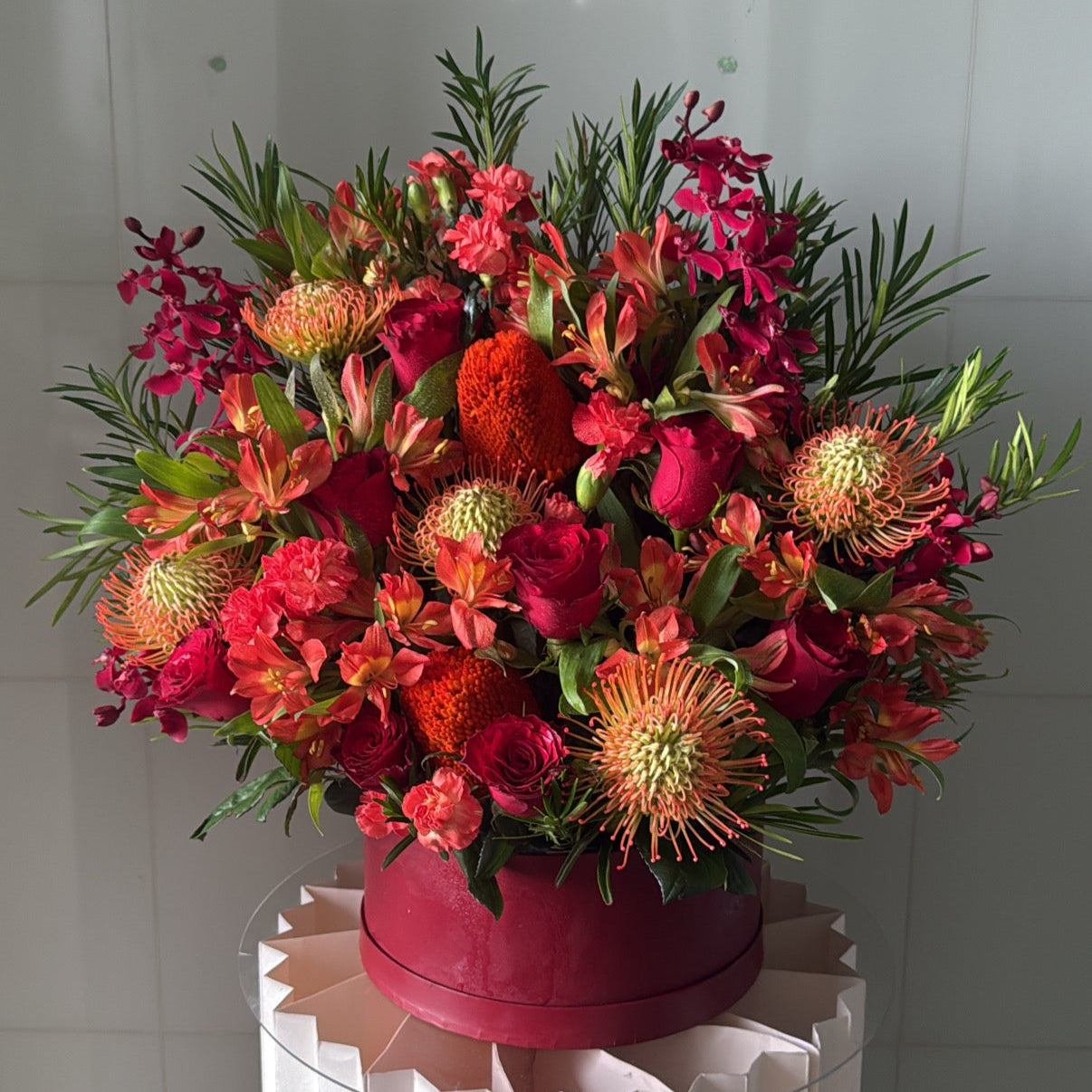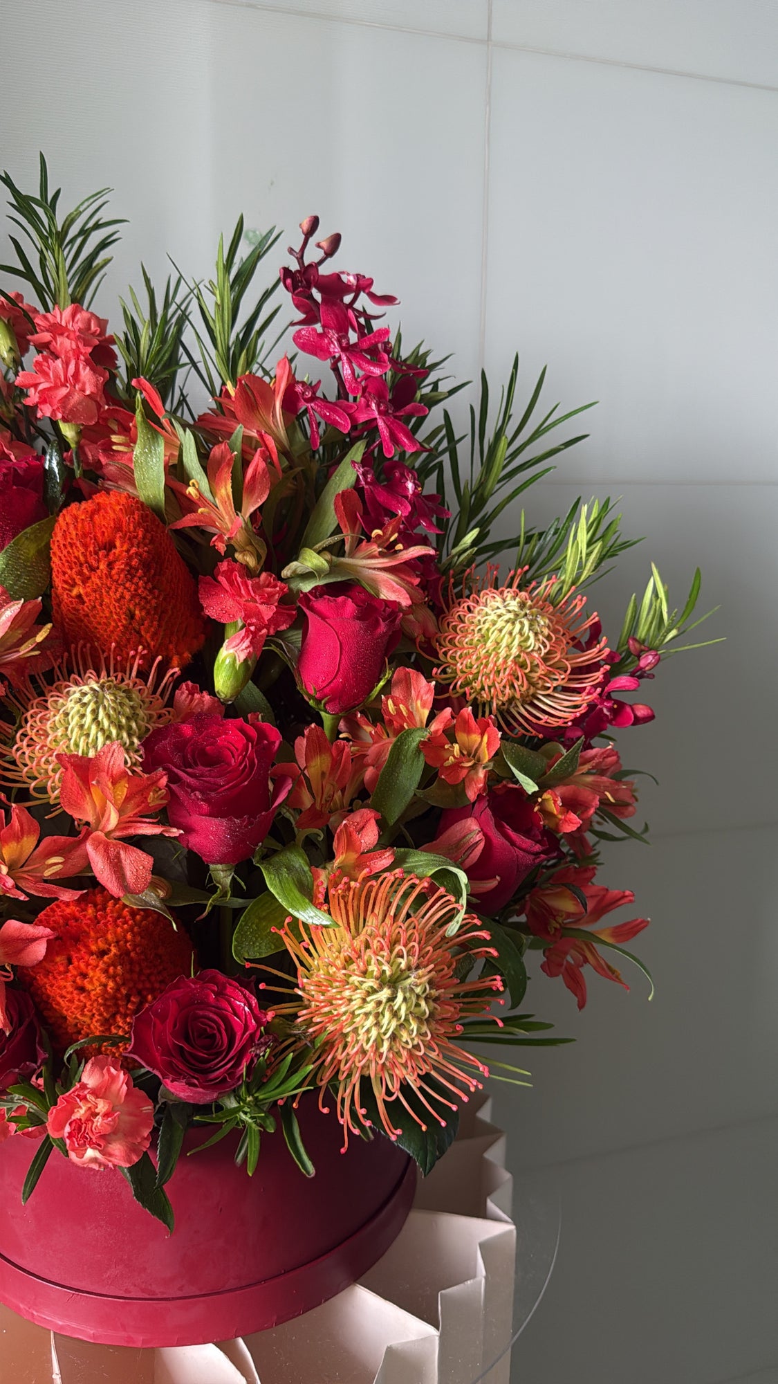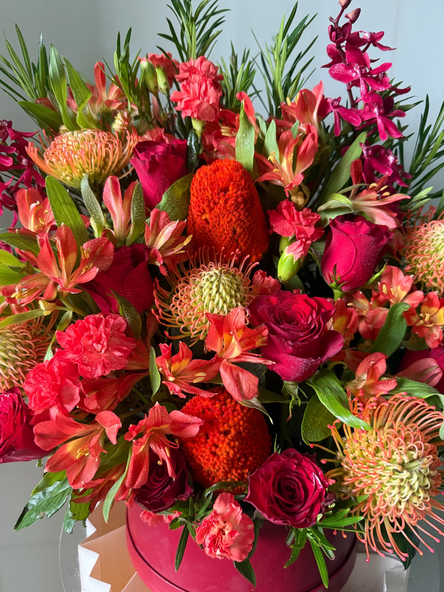 A burst of energy and colour in this exuberant bloombox arrangement, bringing light to any space.